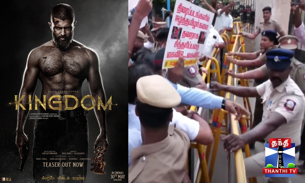 ஈழத் தமிழர்களை குற்றப் பரம்பரை போல் சித்தரிக்கும் தெலுங்கு திரைப்படமான கிங்டம் திரைப்படத்திற்கு எதிராக திரையரங்குகள் முன்பு நாம் தமிழர் கட்சி போராட்டம் நடத்துகிறது.